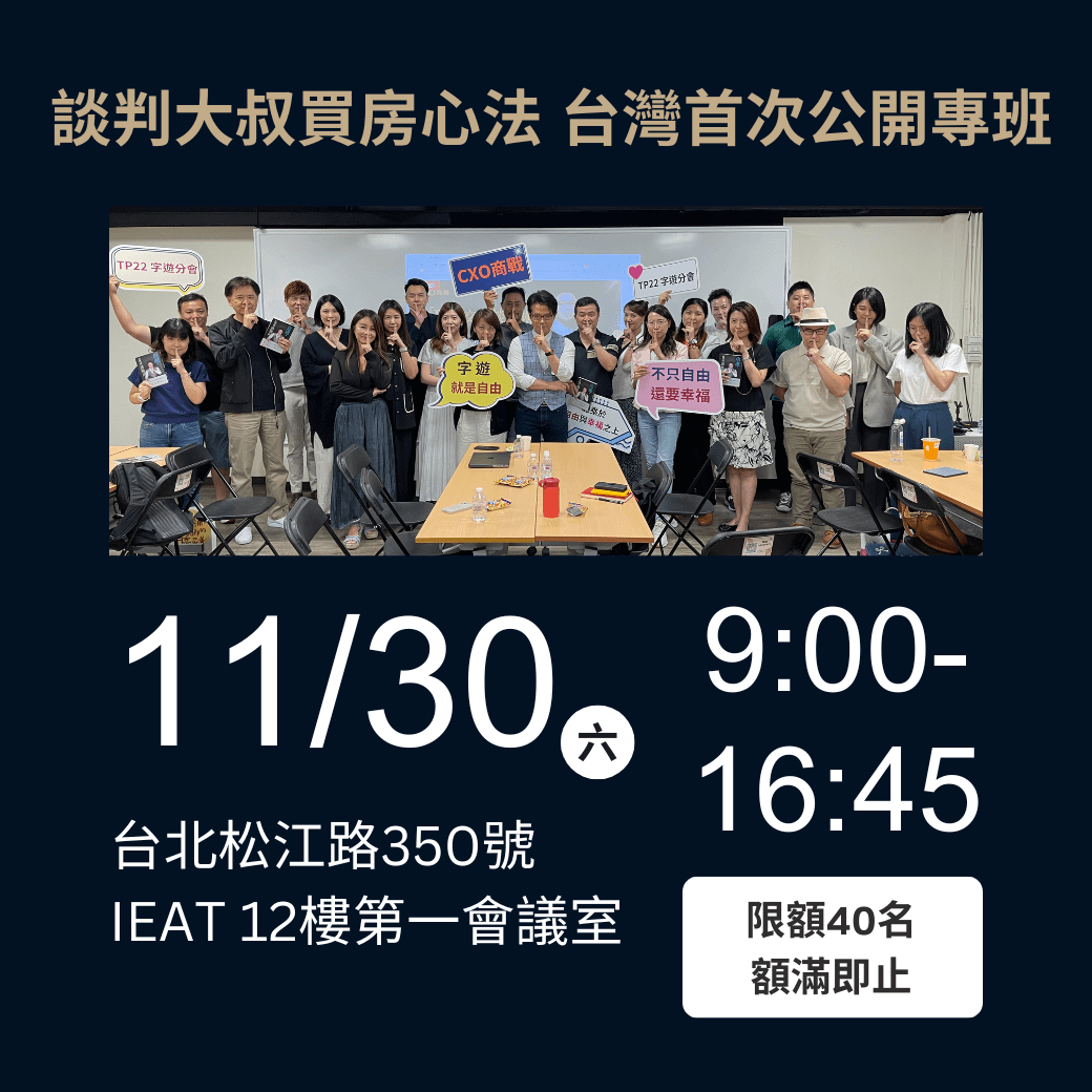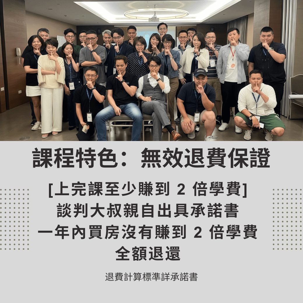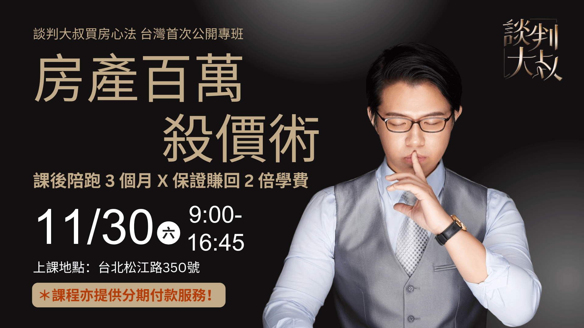 談判大叔買房心法台灣首次公開專班,教你買房必勝的談判殺價術!課後陪跑 3 個月 X 保證賺回 2 倍學費